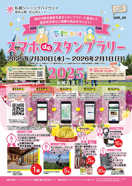 札幌シーニックバイウェイでは、札幌市南区の観光スポットを巡るデジタルスタンプラリーを開催中!集めたスタンプの数に応じて、温泉宿泊券など素敵な賞品が抽選で当たります。この冬、札幌の新しい魅力を発見してみませんか。